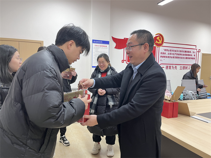 随后,李晓飞书记与龚洁副院长代表学院,为考研学子们送上了精心准备的慰问大礼包,其中包含了学院的祝福贺卡、实用的考研专用文具礼盒以及暖心水果。这份礼物承载着学院对考研学子们的殷切期望与美好祝愿,愿他们在考研战场上旗开得胜,凯旋而归。