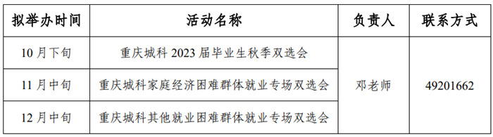 6.如因疫情防控及教学安排影响发生变化,就业中心将及时更改招聘活动计划并告知用人单位和毕业生,请及时关注重庆城市科技学院就业信息网及重庆城科就业创业公众号。