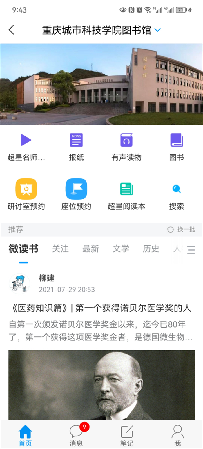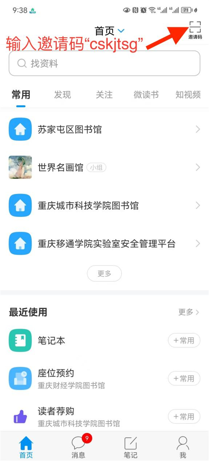 右上角输入邀请码【cskjtsg】进入”重庆城市科技学院图书馆“首页。不仅有“座位预约”“研讨室预约”“超星阅读本”等微应用,还提供了学术视频、图书、报纸等资源。