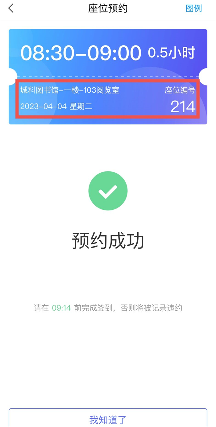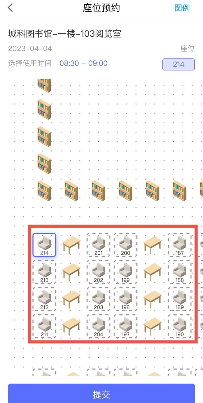 选择“预约时间--预约座位—提交”即预约成功,记得不要忘记20分钟内扫座位二维码完成签到哟!