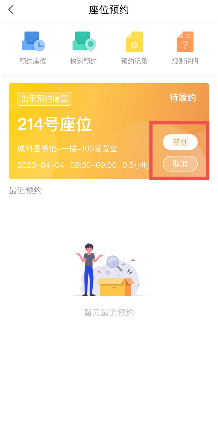 4.点击“座位预约”/“研讨室预约”完成预约。