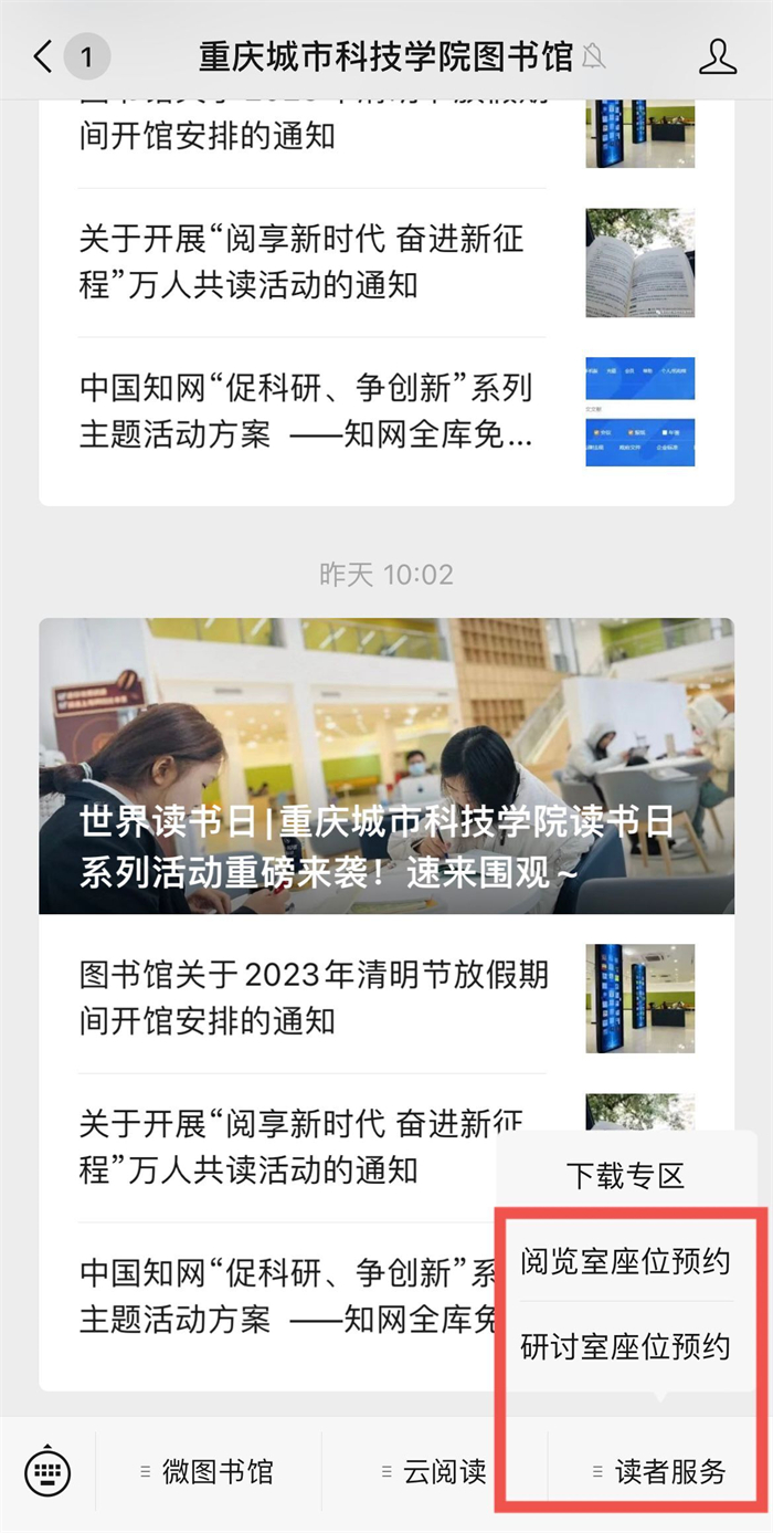 方法二、登陆“重庆城市科技学院图书馆”微信公众号预约