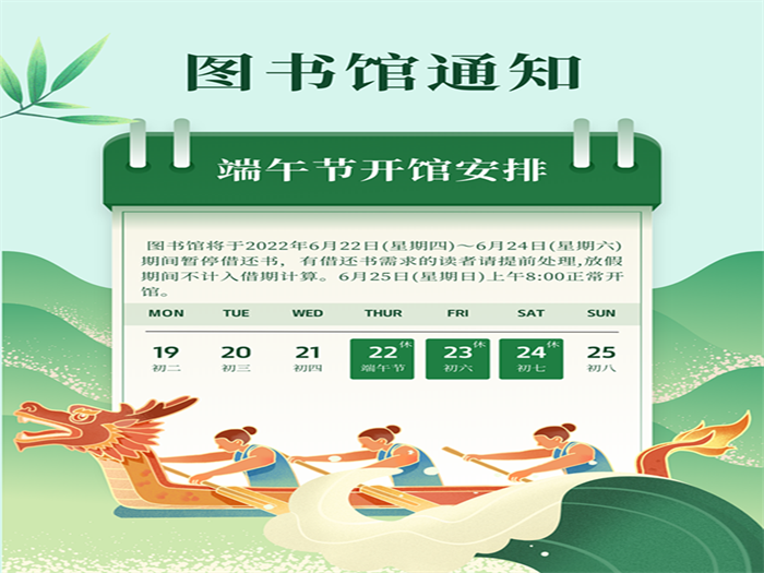 根据学校端午节放假安排,图书馆将于2022年6月22日(星期四)~6月24日(星期六)期间暂停借还书,有借还书需求的读者请提前处理,放假期间不计入借期计算。6月25日(星期日)上午8:00正常开馆。