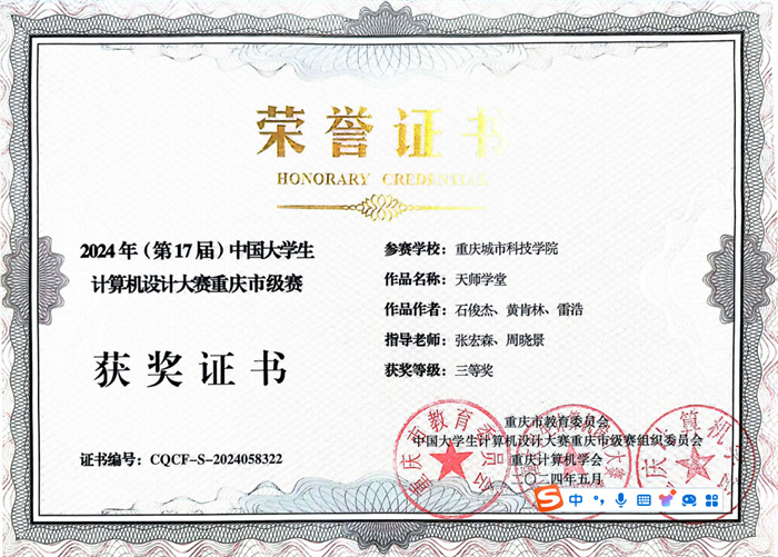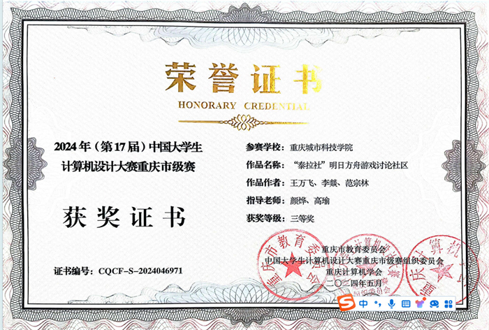 5月12日,第17届中国大学生计算机设计大赛重庆市级赛在长江师范学院举办。在人工智能与大数据学院的精心组织下,共有5支队伍参赛,其中《“泰拉社”明日方舟游戏讨论社区》、《天师学堂》两支队伍获三等奖。