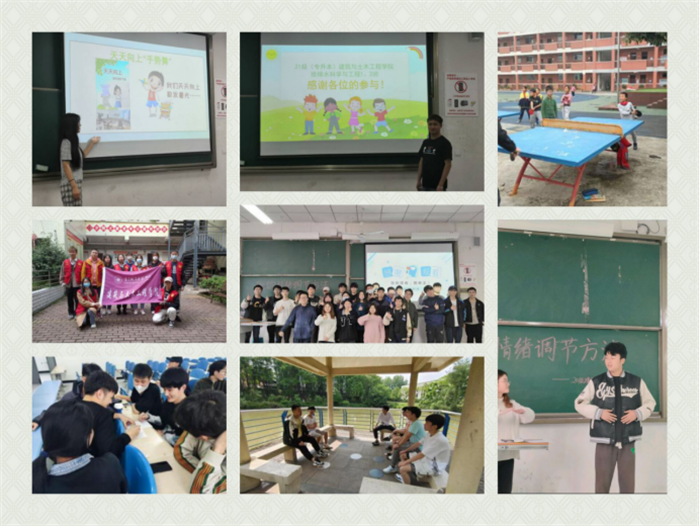 为进一步提高大学生心理健康水平,助推学院“三全育人”格局,加强育人全员、全过程和全方位推进,加强学生遇到心理困境时的自救和求助能力,全面增强健康卫生知识,建筑与土木工程学院通过开展班会宣讲、知识竞答、游戏体验、身心互动等多形式、多角度提升学生心理健康水平。通过5·25大学生心理健康活动收到各类心理作品,其中覆盖了建筑学、智能建造、房屋建造、风景园林等专业,通过激烈角逐推选出大批优秀作品至校赛。