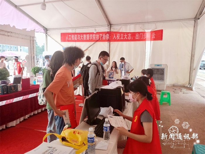 竹海山下,烈日当空。志愿者早早地布置好迎新现场,等待新生的到来。学校领导高度重视本次迎新工作,指导部署现场工作,确保此次迎接2022级新生顺利完成。人工智能与大数据学院领导坚守迎新现场,与志愿者一起守在迎新前线,检查迎新准备工作,协调解决迎新现场存在的问题,并叮嘱志愿者将工作做细做实。新生辅导员也在现场为新生排忧解难,深入新生群体了解情况,与新生交流沟通,为新生入学报到提供暖心关怀。