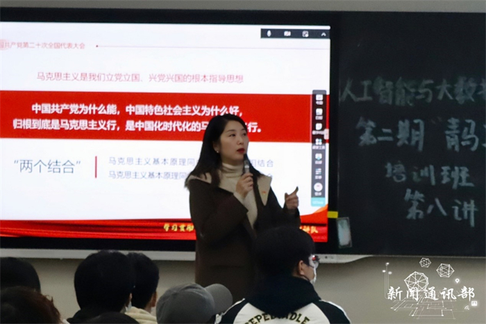 活动伊始,党总支副书记张念将党的二十大主题分为三方面讲解,号召全体同学:“务必不忘初心、牢记使命;务必谦虚谨慎、艰苦奋斗;务必敢于斗争、善于战斗”,并以“3+16+4”回顾过往,即3件大事,16个方面的历史性成就、历史性改革和4个方面的里程碑意义。弘扬伟大建党精神,自信自强、守正创新、踔厉奋发、勇毅前行,切实加深人工智能与大数据学院青年学子对党的二十大精神的理解和把握,为全面推进中华民族伟大复兴贡献智慧和力量。