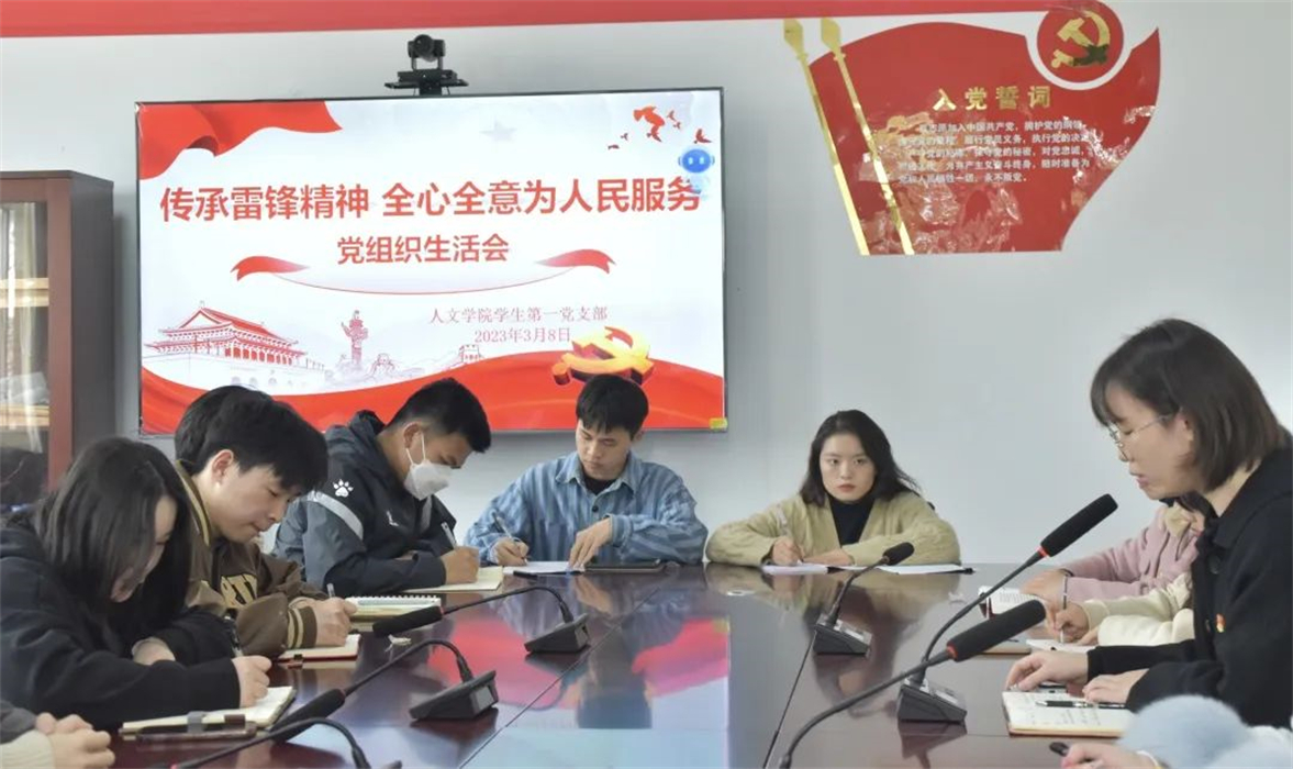 为进一步落实党支部组织生活,发扬党的优良作风,提升党支部思想凝聚力、政治领悟力,昭彰信息化时代下基层党组织浓厚“党味”。3月8日中午,人文学院学生第一党支部利用党的组织生活制度这一重要抓手,于223党员活动室组织开展3月党组织生活会。会议主题为“传承雷锋精神,全心全意为人民服务”,党总支组织委员田甜、学生第一党支部书记郎月婷、组织委员毛鳗翎、宣传委员邓颖蕾及全体党员同志参与其中。会议由郎月婷主持。