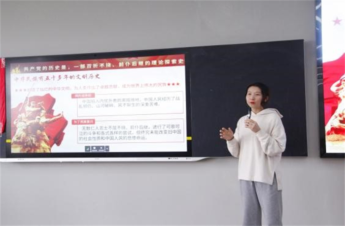 会议伊始,团学指导老师魏倩从“重温党102年的光辉历史,深刻感悟党的初心使命”和“践行初心使命,必须担当行为”两个方面对学党史进行了详细阐述。她结合中华民族五千多年来的文明历史,紧密围绕党的最高理想、最终目标、初心使命进行讲述。最后,通过党的二十大报告,她强调了青年对当今时代的重要性并且希望大学生能把个人理想与家国情怀合二为一,脚踏实地、勤勤恳恳,担当起自己的责任与使命。