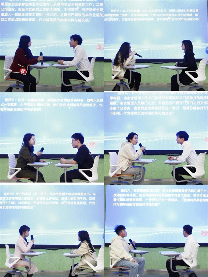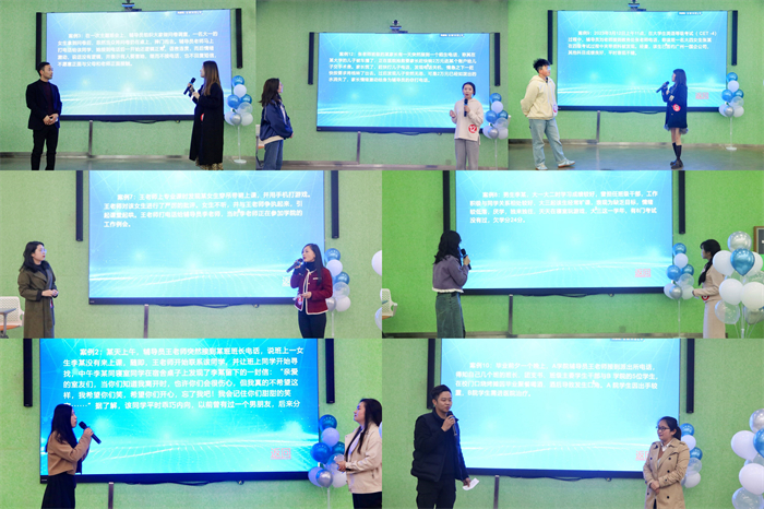 3月14日,激动人心的决赛随初赛回顾视频的播放激烈展开,案例研讨和谈心谈话是本次比赛主要考核的两大版块。比赛现场,参赛辅导员们两人一组通过现场抽题,针对不同类型学生案例互相提问,回答方利用较为全面的知识储备,从多个角度、多个层面分析案例,有目的性、针对性、实效性、可操性的提出解决办法;谈心谈话环节,辅导员们根据随机问题,以情景再现的方式展开,充分利用所掌握的相关知识和技能,引导学生正确认识生活中遇到的感情、人际关系、安全教育、突发事件处理等问题,并指导学生以正确的方式解决。