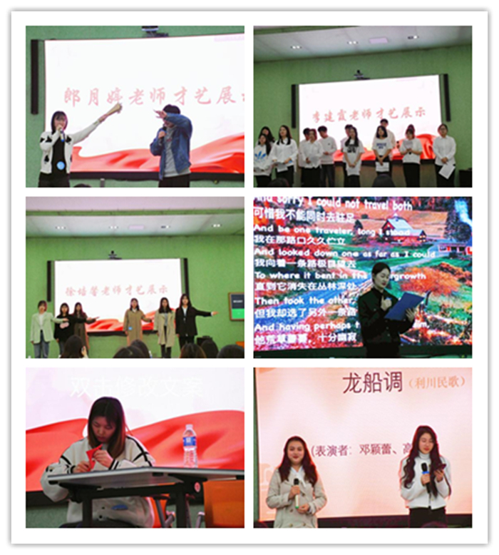 才艺展示环节,参赛辅导员使出浑身解数,唱歌、朗诵、配音、器乐轮番上阵。此次比赛,充分展现了学院辅导员们的风采,提高了团队凝聚力,缓解了辅导员压力,同时也昂扬了积极向上的精神风貌。