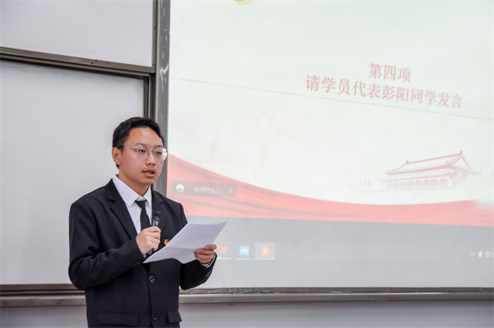 本期学员代表彭阳发言,他借用党的二十大报告中提出的重要讲话:“当代中国青年生逢其时,施展才干的舞台无比广阔,实现梦想的前景无比光明。”进一步号召大家作为新时代新青年,要珍惜本次党课学习的机会,坚定入党信念,坚定不移听党话、跟党走,让青春在全面建设社会主义现代化国家的火热实践中绽放绚丽之花。