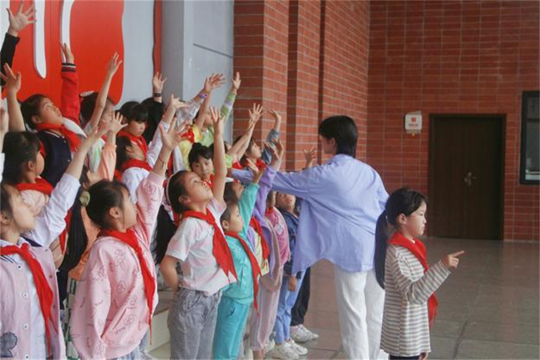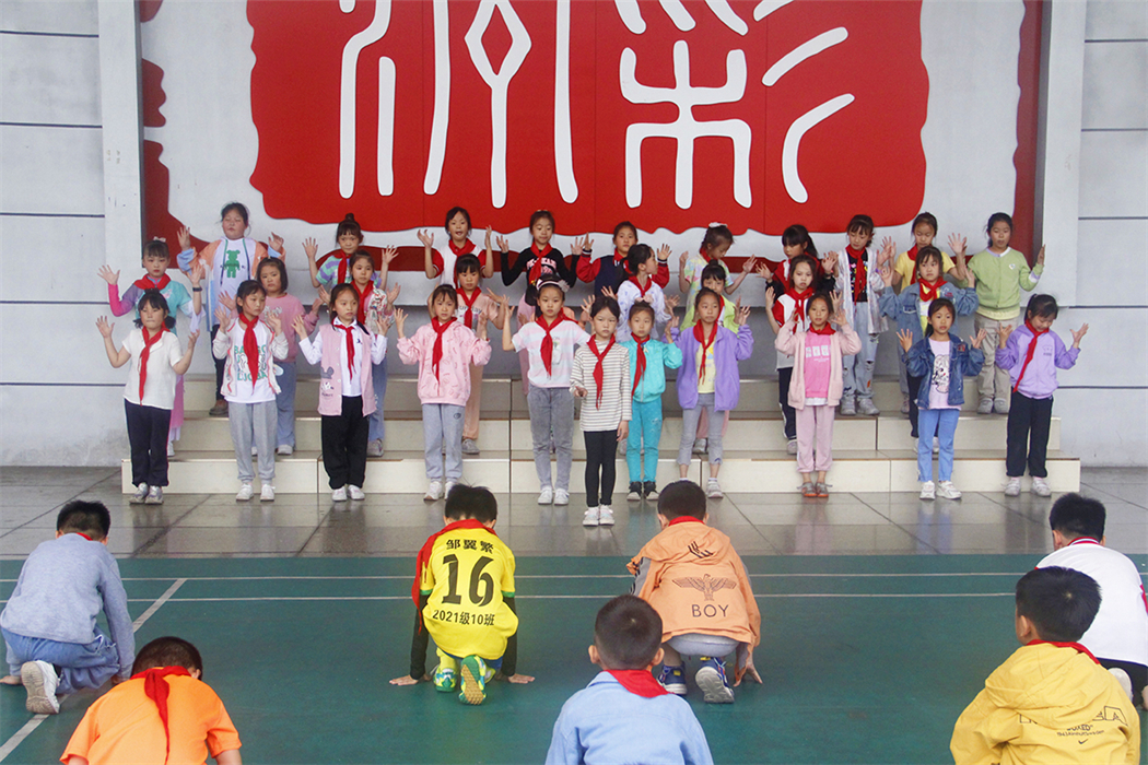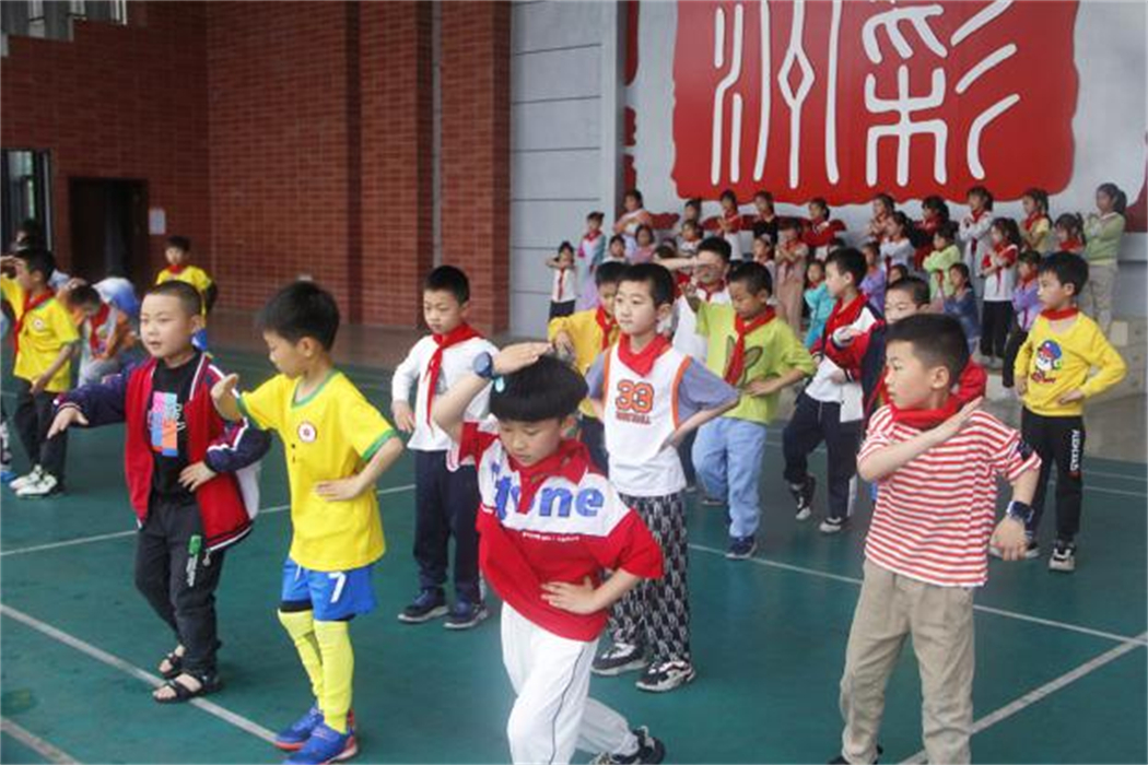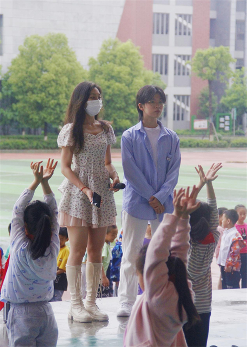 4月18日上午,建筑管理学院舞蹈队为五洲小学二年级10班的升旗仪式节目排练有序筹备中。