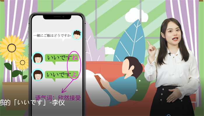 第三组是日语组的李仪老师团队,课程主题为《令人困惑的いいです》。视频中李老师讲述了两个有趣的故事来反映对于いいです的误用,以及之后也讲解了该表达的正确使用语境,整体语言表达极具活力。