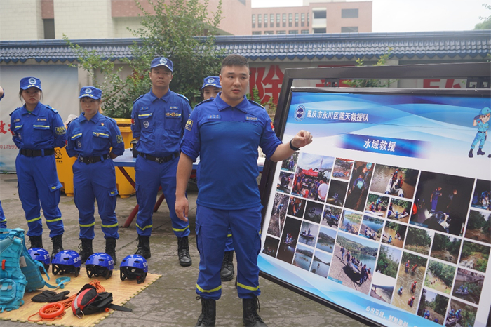 活动开始,由永川区蓝天救援队何队长向党员同志们介绍本次活动内容:一是讲述有关蓝天救援队的成立初衷及服务宗旨,让党员同志们深刻了解到永川区蓝天救援队作为政府应急体系的辅助力量。救援内容主要是以灾害救援领域开展生存、飞控、通讯、水域、心理、防疫等方面为主,协助配合政府应急体系完成各种灾难事故的紧急救援公益组织;二是深刻讲解救援队有关日常训练的项目及流程,使党员同志们体会到救援队为保证救援成功率所付出的相关辛苦及努力。