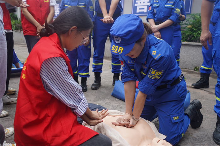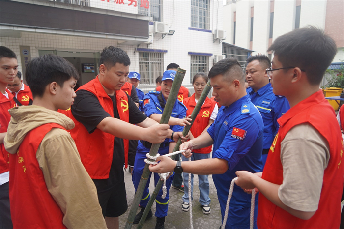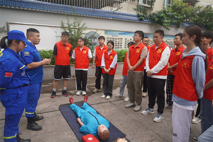 最后,由蓝天救援队何队长对党员同志们进行森林灭火、地震、洪水等常见灾害应急救援装备的有关展示和讲解。他带领党员同志们学习如何正确穿戴应急防护服、简易高效的制作人体担架、正确进行心肺复苏和演练对应灾害的救援步骤及方法。何队长通过现场模拟实操让党员同志们精确掌握技巧和方法,使党员同志们熟练掌握避险自救技能。
