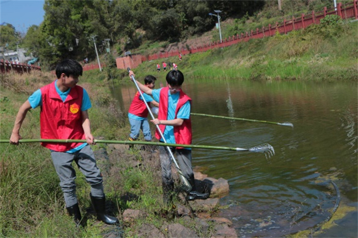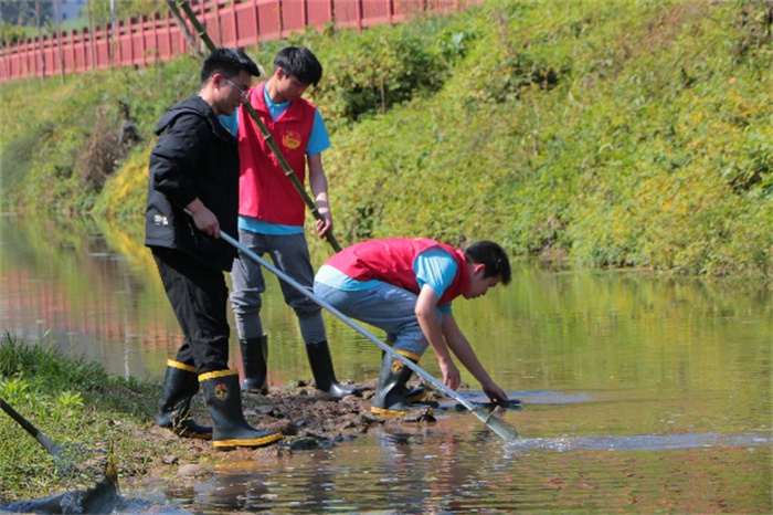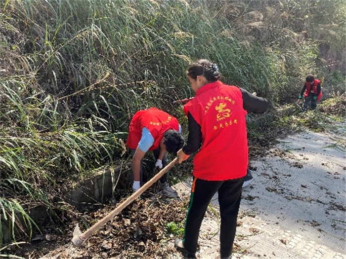 在另一边,给排水科学与工程专业的志愿者利用其专业知识开展河道清理工作:清理河道淤塞、科学沉降杂质、清理杂草、整理绿化区域收口、驳岸侧壁清表美化,不仅有效保护了河道的水资源,也为后续村民使用河道水灌溉良田提供了便利。