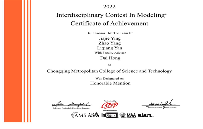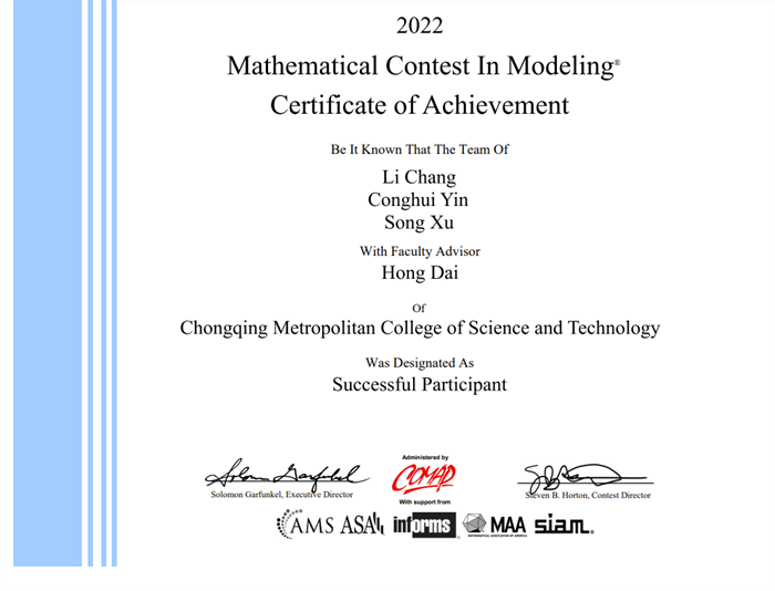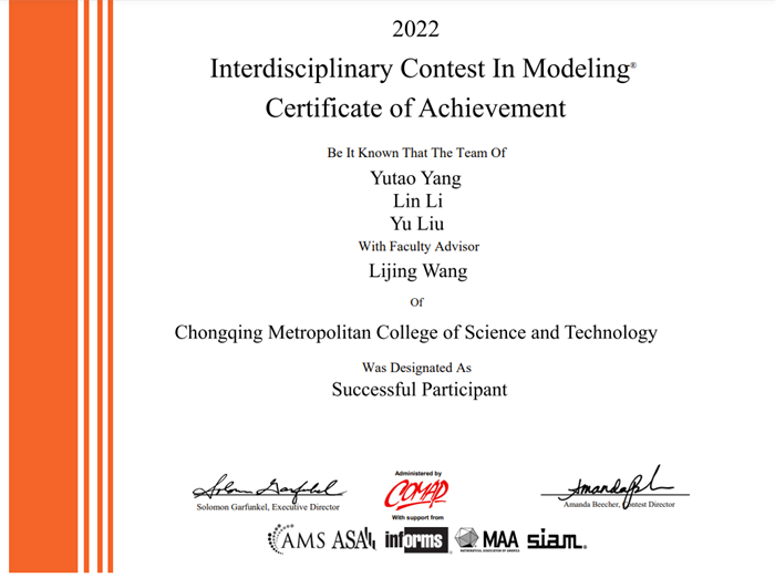 近日,2022年美国大学生数学建模竞赛(MCM/ICM)成绩公布。我校共五支参赛队伍,经过激烈角逐,应嘉杰、鄢立强、赵洋组成的团队,最终荣获国际二等奖(H奖),还有两支参赛队伍荣获成功参赛奖(S奖)。