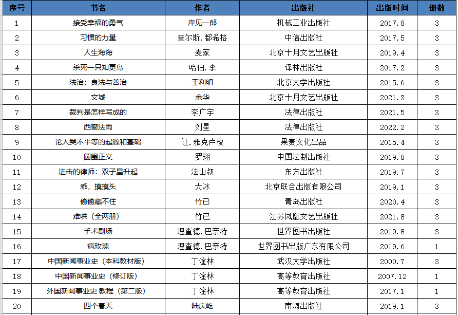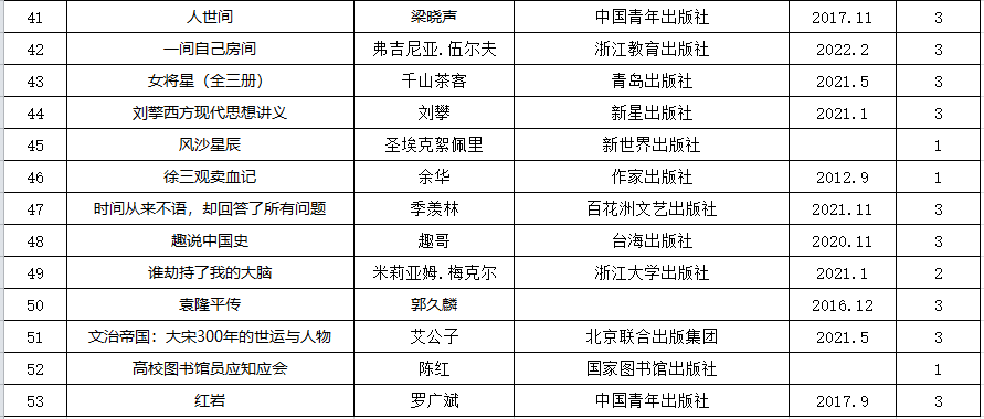 在4.23日“你荐书,我买单”活动结束后,重庆城科图书馆工作人员整理出读者们推荐的图书书目,通过与馆藏文献对比查重后,在当当网上采购了馆内没有的图书,共计53种、158册,经过加工上架,已可对读者流通借阅。具体购买图书见下图: