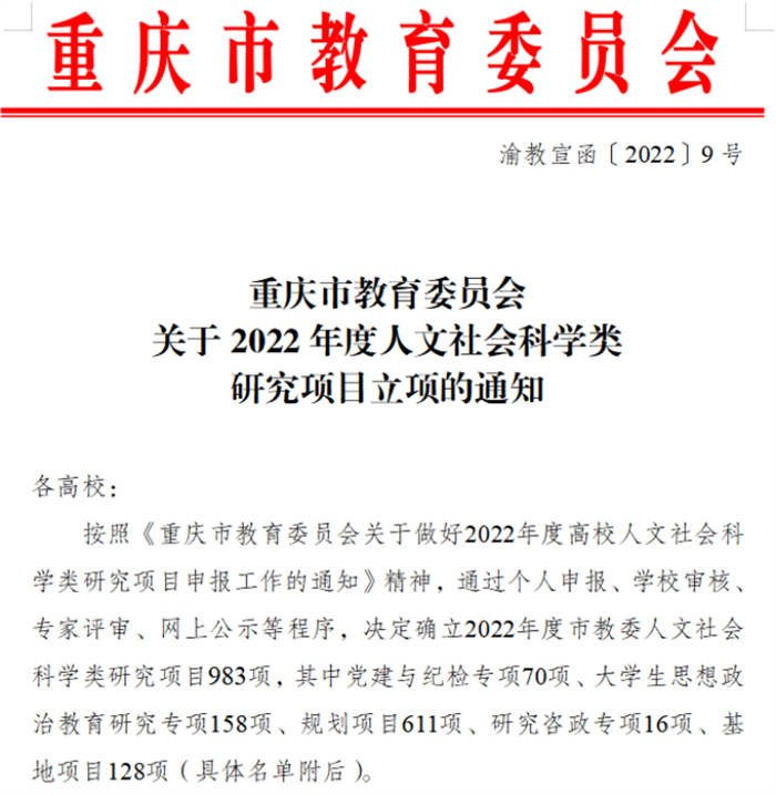 近日,重庆市教育委员会公布了《关于2022年度人文社会科学类研究项目立项的通知》(渝教宣函〔2022〕9号),我校获1个重点项目和6个一般项目立项。