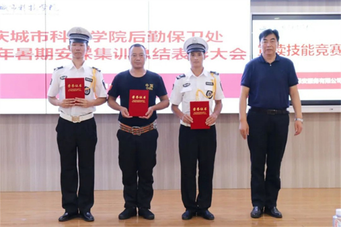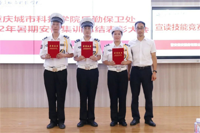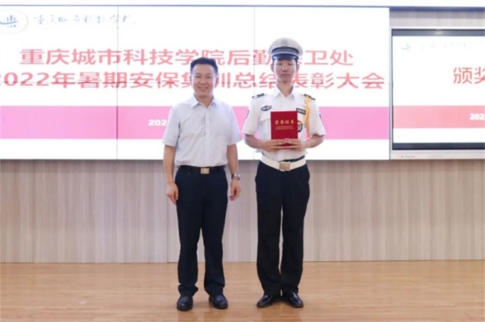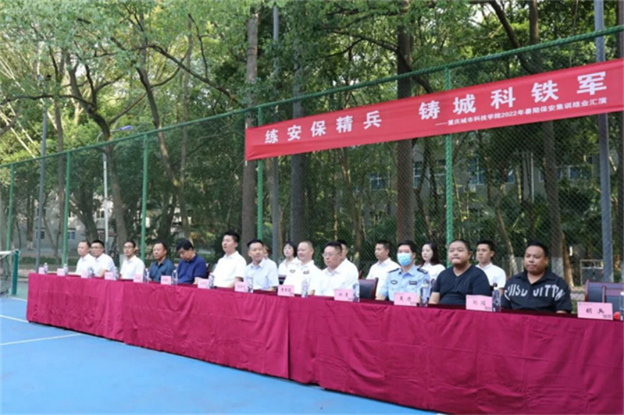 安全稳定是学校办学发展的重要基石,安保团队是构筑安全屏障的中坚力量,为加快推进平安校园建设,打造一支能战善干的城科铁军,8月16日,重庆城市科技学院开展2022年暑期安保集训总结大会,对暑期安保集训成果进行检验和总结。重庆永川区公安局校保支队政委袁新忠,学校理事长刘学民,副校长郭建礼,重庆警安保安服务有限公司总经理费孝国、副总经理吴继光,重庆华辰生态农业发展有限公司、重庆三福物业有限公司、重庆农业机械化学校相关人员,学校后勤保卫处相关人员参加大会,大会分为安保集训结业汇演及总结表彰大会两部分,会议由后勤保卫处处长胡兵主持。