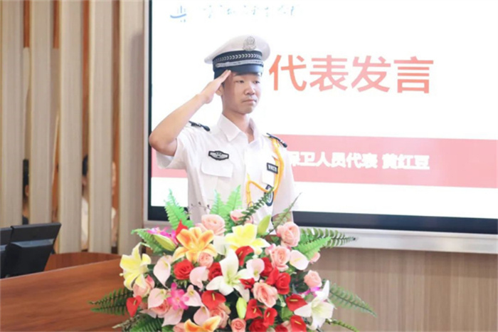 后勤保卫处安保班长黄红豆分享了集训工作中的收获与成长,他表示,集训既是磨炼意志的“练兵场”,更是充满挑战的“大擂台”,安保队员们在集训中互相扶持,这股力量支撑着大家努力坚持了下来,练就了强健的体魄和坚毅的品格,安保工作有了更足的底气,并对接下来的工作充满信心。