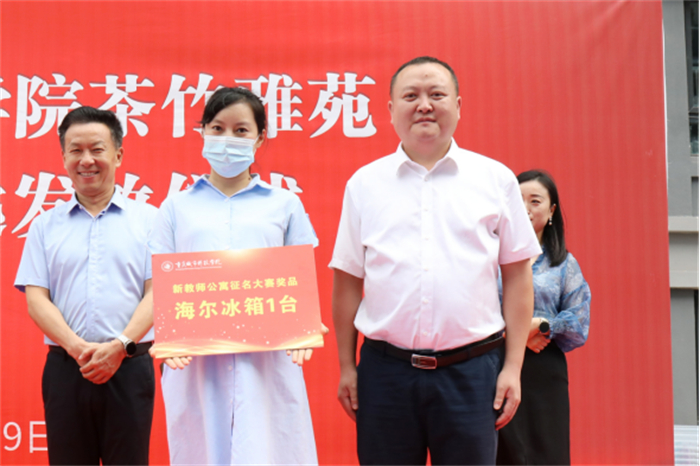 学校面向全校师生开展了三期教师公寓命名征集活动,最终评选出“茶竹雅苑”为三期教师公寓雅名。副校长余林向征名获奖者人文学院朱莉老师颁奖。