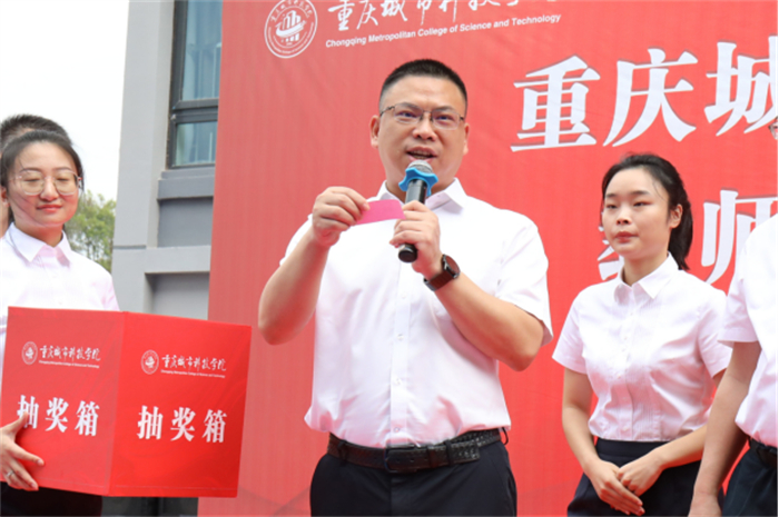 仪式现场,永川高新区管委会主任盛逵,学校党委书记、政府督导专员王银峰分别抽出海尔冰箱和海尔洗衣机各一台,并为获奖者颁奖。