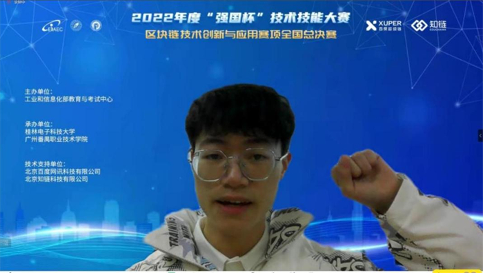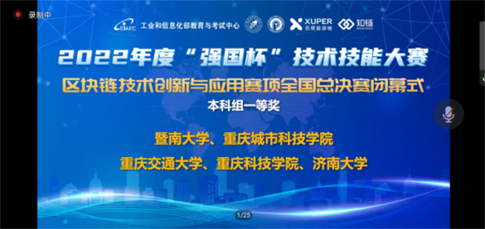 2022年12月3日, 由工业和信息化部教育与考试中心主办的“2022年度“强国杯”技术技能大赛--区块链技术创新与应用赛项”全国总决赛在云端成功召开。人工智能与大数据学院2019级软件工程专业本科学生薛伟、田园、王万飞、范宗林团队荣获全国总决赛一等奖!