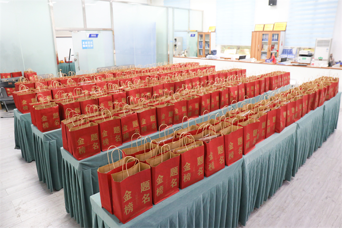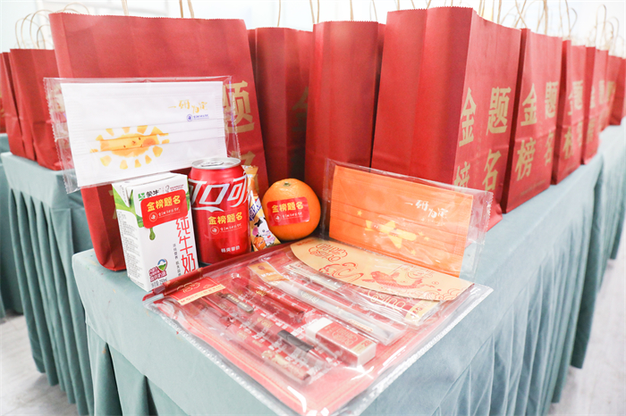 学校大学生就业指导服务中心精心准备了600余份精美礼物,分别蕴含着美好的寓意:香橙寓意心想事“橙”、“橙”功上岸;牛奶寓意“牛”气冲天;可乐寓意可“喜”可“乐”;“金榜题名”定制文具套装助力考生妙笔生花;棒棒糖寓意金“棒”提名;印有一“研”为定及学校Logo的专属口罩则代表文星高“罩”。每一份福袋都是一份温暖、一份祝福,祝福城科考研学子们成功上岸、梦想成真!