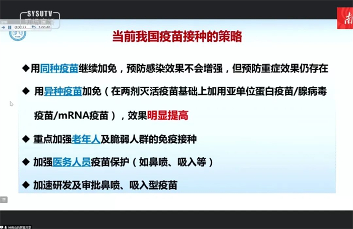 钟南山院士围绕三年多来抗疫取得的成就,系统分析了全国范围第二波奥密克戎疫情的特点、介绍了奥密克戎的生物学特征、致病性以及在大学校园内如何加强个人防护。在讲座中,钟南山院士对“不同地方的毒株致病性不同”“奥密克戎是否有后遗症”“越晚变‘阳’症状越轻”等热点话题作出回应,并强烈呼吁加速疫苗接种,特别是异种疫苗的加强接种。