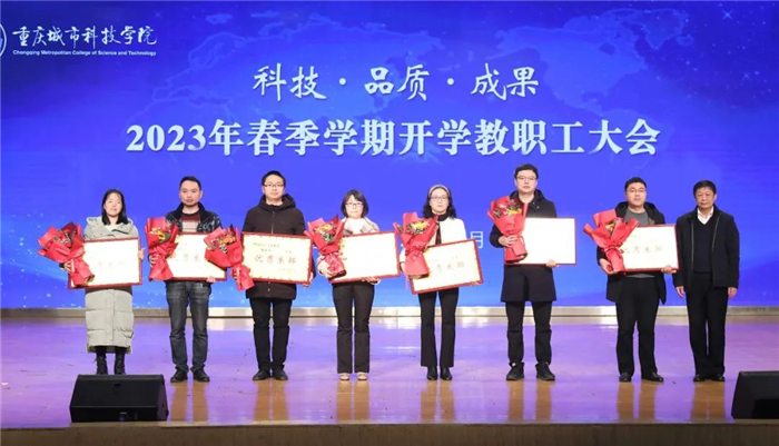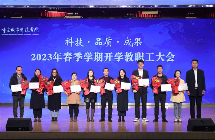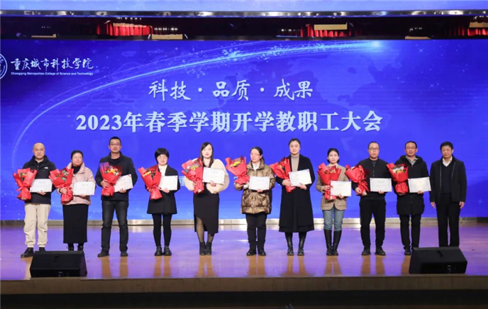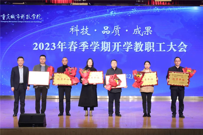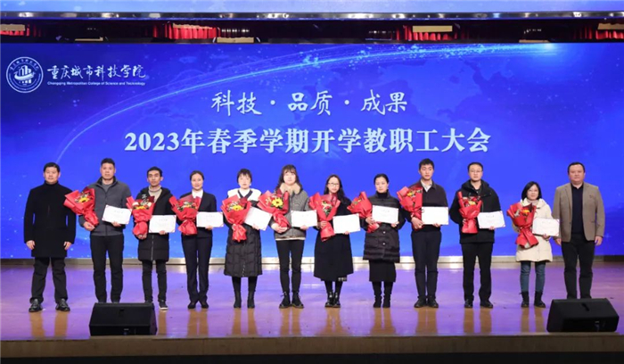 副校长童精明宣读《重庆城市科技学院关于表彰2022年突出贡献单位和突出贡献个人的决定》、《重庆城市科技学院关于表彰2022年度优秀单位和优秀个人的决定》。与会校领导共同为受表彰的单位和个人颁奖,勉励大家再接再厉,做学校事业发展的建设者、参与者和奋斗者,为学校高质量发展赋能添彩。