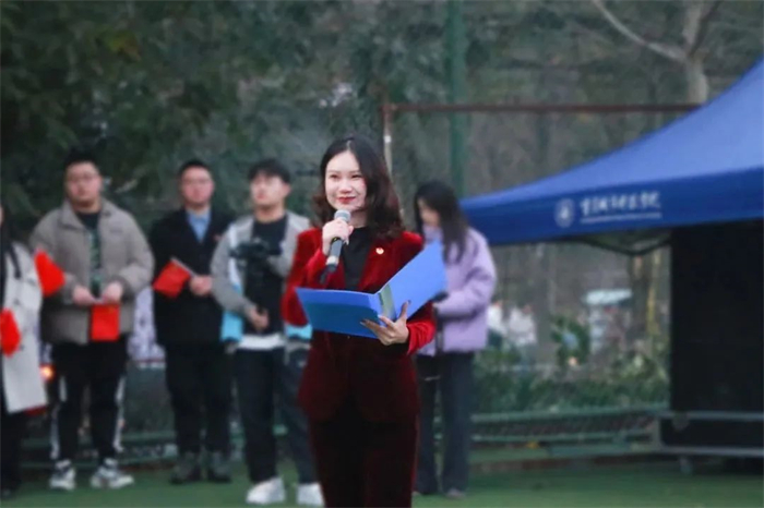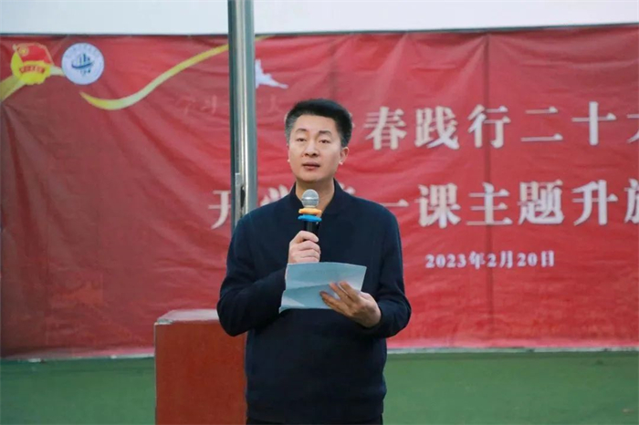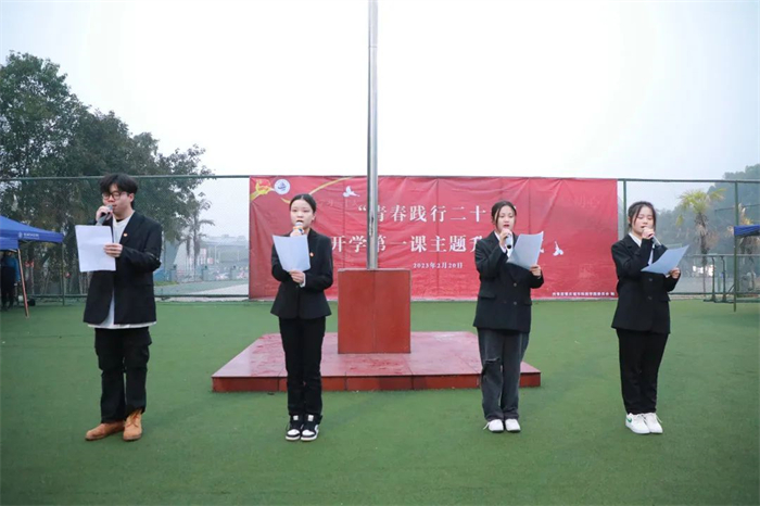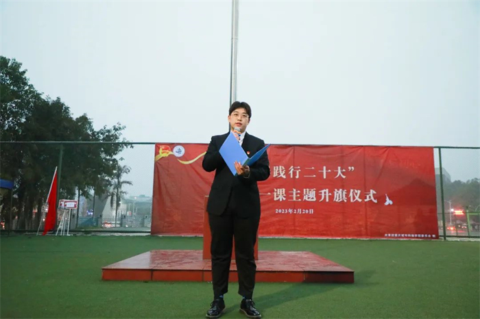 为积极响应“学思践悟二十大,青春奋进新征程”的号召,团结引领广大青年学子将“请党放心,强国有我”的铿锵誓言内化于心、外化于形,以实干实绩学习领会二十大重要精神。2月20日7:20,重庆城市科技学院于田径场开展“青春践行二十大”开学第一课主题升旗仪式。学校副校长郭建礼,学生处负责人,团委负责人,各二级学院党总支(副)书记以及教师代表、团学骨干代表、学生代表参加此次活动,现场由王晨妃同学主持。