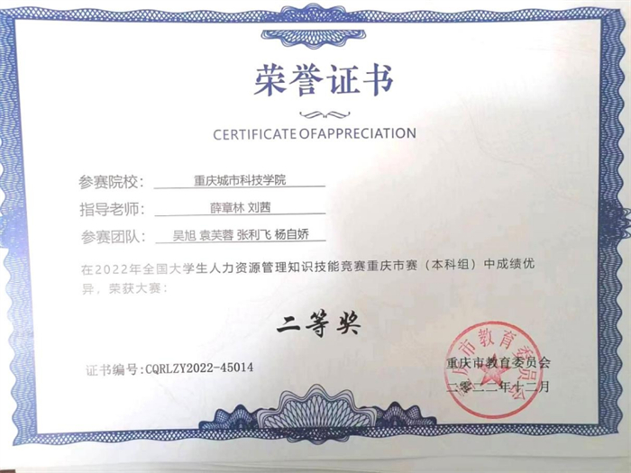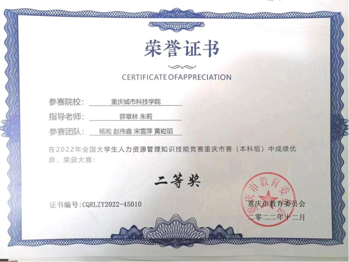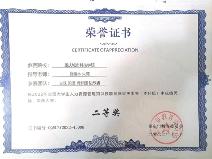 本次比赛分为方案设计和竞争对抗两个比赛阶段,围绕人力资源六大模块使学生在市场分析、战略制定、营销管理和财务管理等一系列经营活动中实现人力资本投资回报率和员工价值的提升。在两位老师的精心指导下,参赛队员密切配合,充分发挥各自的特长和优势,认真分析市场环境,与其他参赛队伍斗智斗勇,揣测对手可能采取的行动,做好各项应对措施。最终,经过4个多小时的激烈角逐,重庆城市科技学院代表队均荣获重庆市赛二等奖。