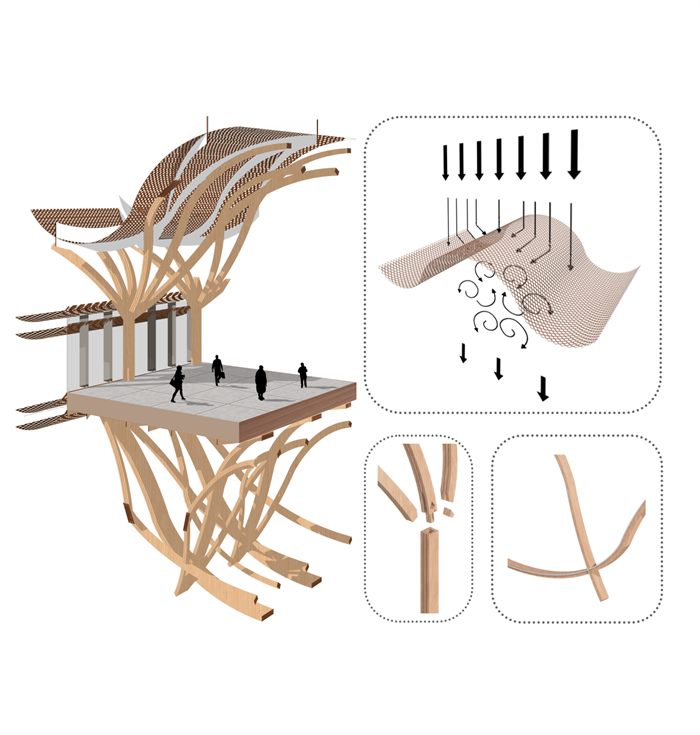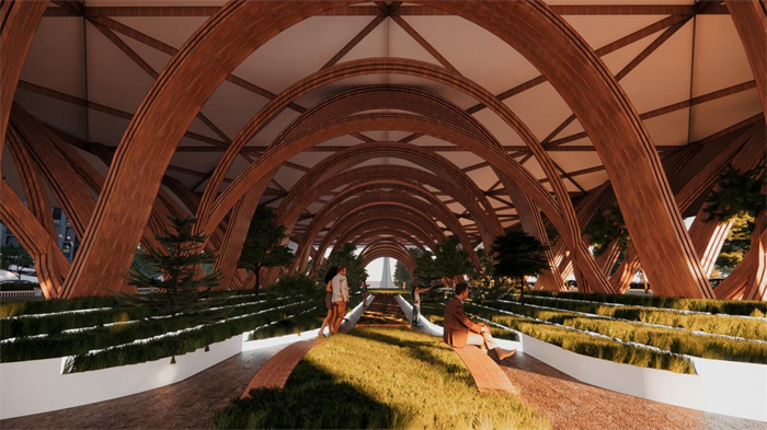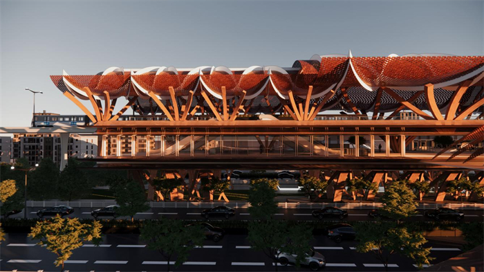 现代的文明让我们被困在钢筋水泥丛林,在发展绿色建筑的热门话题下,本设计拟建造一处集城市绿色公园、轻轨站于一体的新型休闲交通枢纽集合体,以建筑生态美学的观念为指导思想,探究人居环境和生态环境协调的更多可能。轻轨站从“生命之树”中提取立柱的形象,使建筑充满动感,寓意从森林到建筑生生不息的自然力量,增加空间叙事性。采用传统藤编与结合现代工艺相结合营造模仿“波浪”的曲面屋顶,一展轻轨站构件美学与力学的统一。旨在为栖居在钢筋混凝土森林中的人们提供一处快中有慢、闹市寻静的场所,在往来交通换乘的繁忙中可以寻一处静谧之地,慢下脚步,缓下身心,大隐于市。