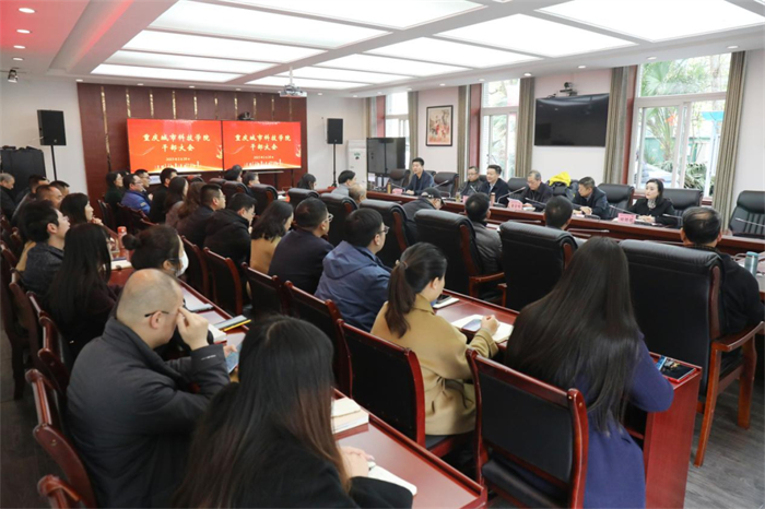 2月28日下午,重庆城市科技学院于第一行政楼101会议室召开干部大会,宣布学校理事会关于黄宗明同志任职的决议。学校领导班子、全体中层干部参加大会,会议由党委书记、政府督导专员王银峰主持。