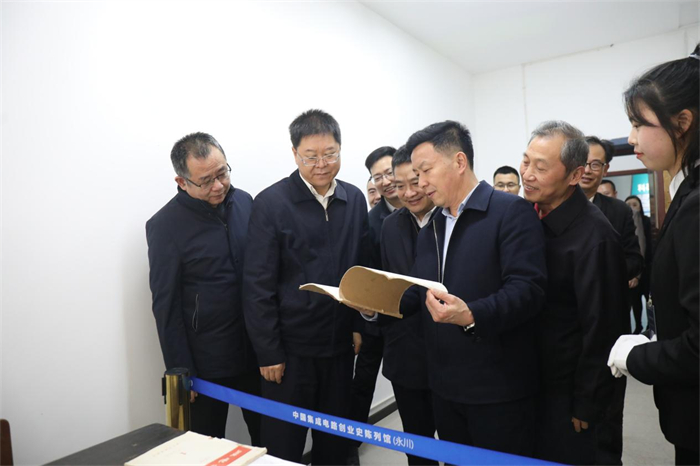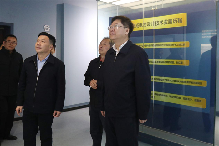 黄政一行来到校内重庆市级、永川区级爱国主义教育基地——集成电路创业史陈列馆。在刘学民和学生讲解员的介绍中,领导们一起感怀了中国集成电路的那段艰苦奋斗、追求卓越的创业发展历程。黄政给予学校对原1424研究所的保护工作高度的肯定,勉励学校要充分发挥基地阵地作用,用科学家精神影响青年、感召青年、引领青年,激发当代大学生投身科研事业的激情和自信,鼓励当代大学生勇攀世界科技高峰。