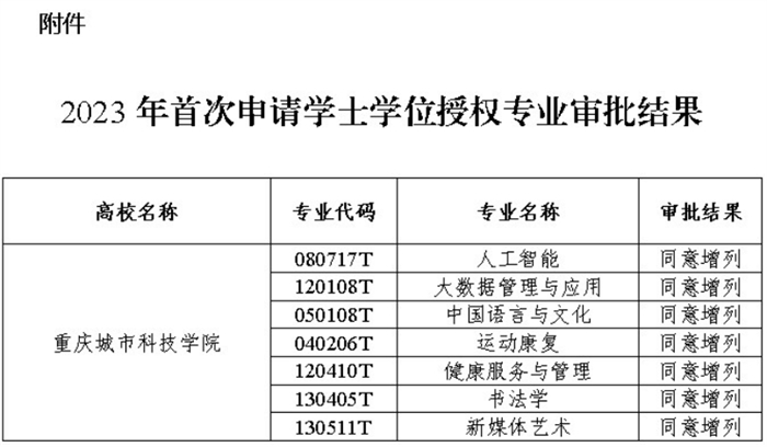 近日,经重庆市学位委员会评审,公布了《关于公布2023年首批申请学士学位授权专业审批结果的通知》 (渝学位发〔2023〕1号),同意增列重庆城市科技学院运动康复、中国语言与文化、人工智能、大数据管理与应用、健康服务与管理、书法学和新媒体艺术七个学士学位授予专业。