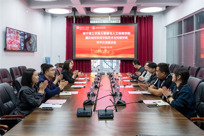 在六教路演室,双方进行了学术交流座谈会,艺术与传媒学院副院长王颖主持会议。王颖代表艺术与传媒学院对南宁理工学院大数据与人工智能学院同行的到来表示热烈欢迎,并逐一介绍与会嘉宾。