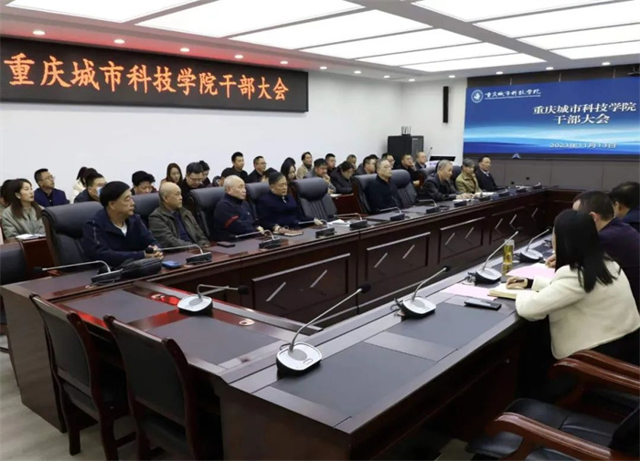 11月13日下午,重庆城市科技学院于第一行政楼101会议室召开干部大会,宣布学校理事会关于吴敏同志任职的决议。学校领导班子、全体中层干部参加大会,会议由党委书记、政府督导专员王银峰主持。