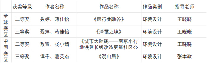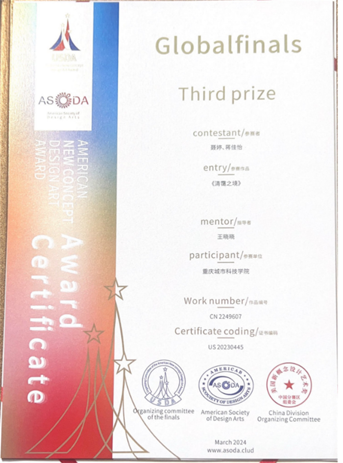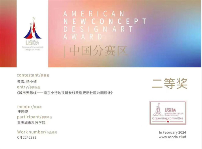 近日,2023“USDA美国新概念艺术奖”圆满结束,建筑与土木工程学院风景园林专业参赛学生在环境设计类共获奖4项。其中,全球赛区获二等奖1项、三等奖1项;中国分赛区获二等奖1项、三等奖1项。