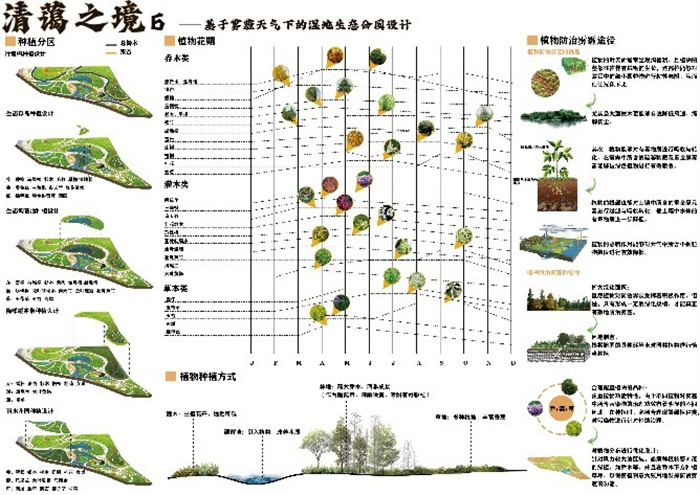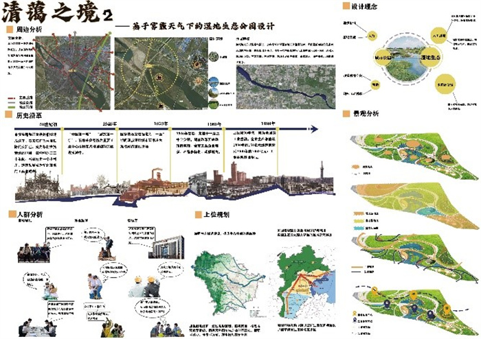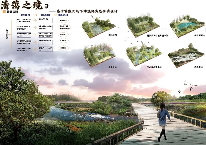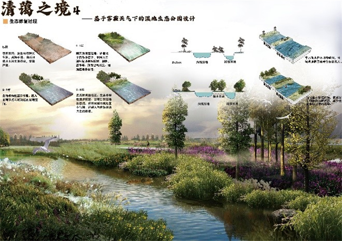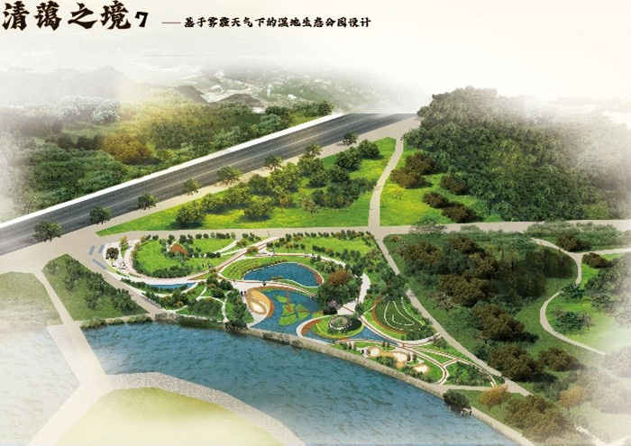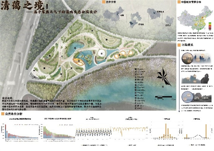 设计说明:随着河北省工业的迅速发展,京津冀地区的雾霾气象灾害日趋严重。本次项目位于河北省石家庄市正定县浮沱河流域的一块闲置空地,场地面积约万平方米。本次设计着力于通过打造生态湿地公园,从生态功能方面采用雨水花园、生态浮岛形式打造湿地,在形态功能上打造城市会客厅板块。致力于城市公园与湿地公园相结合的生态公园。