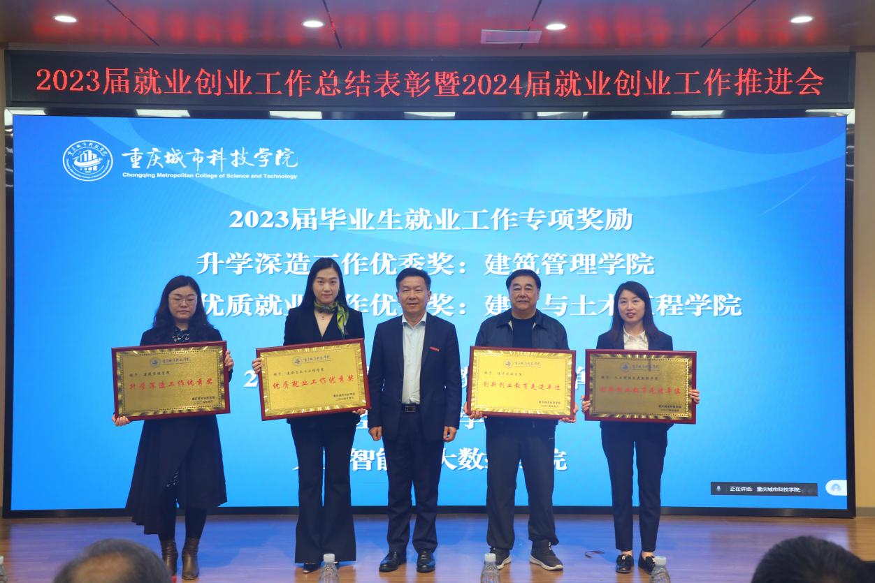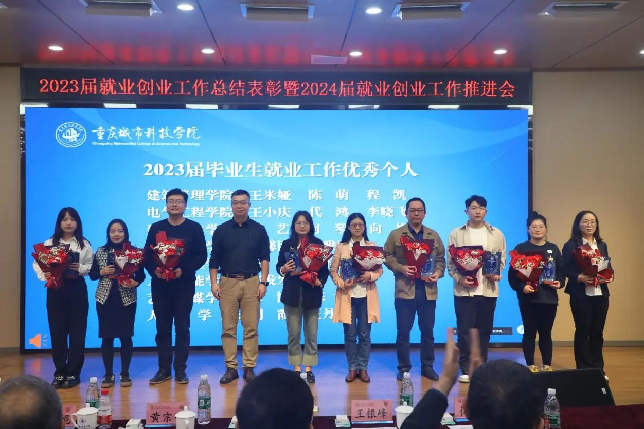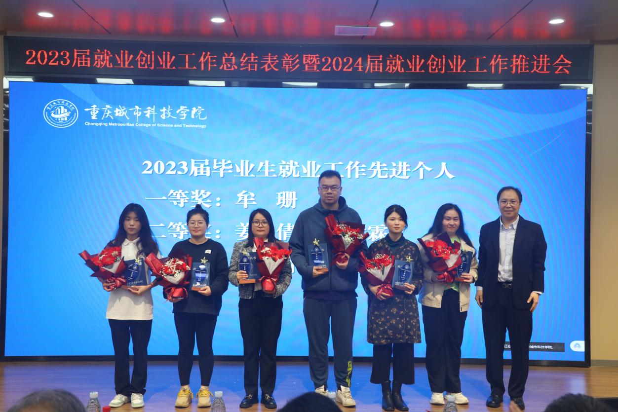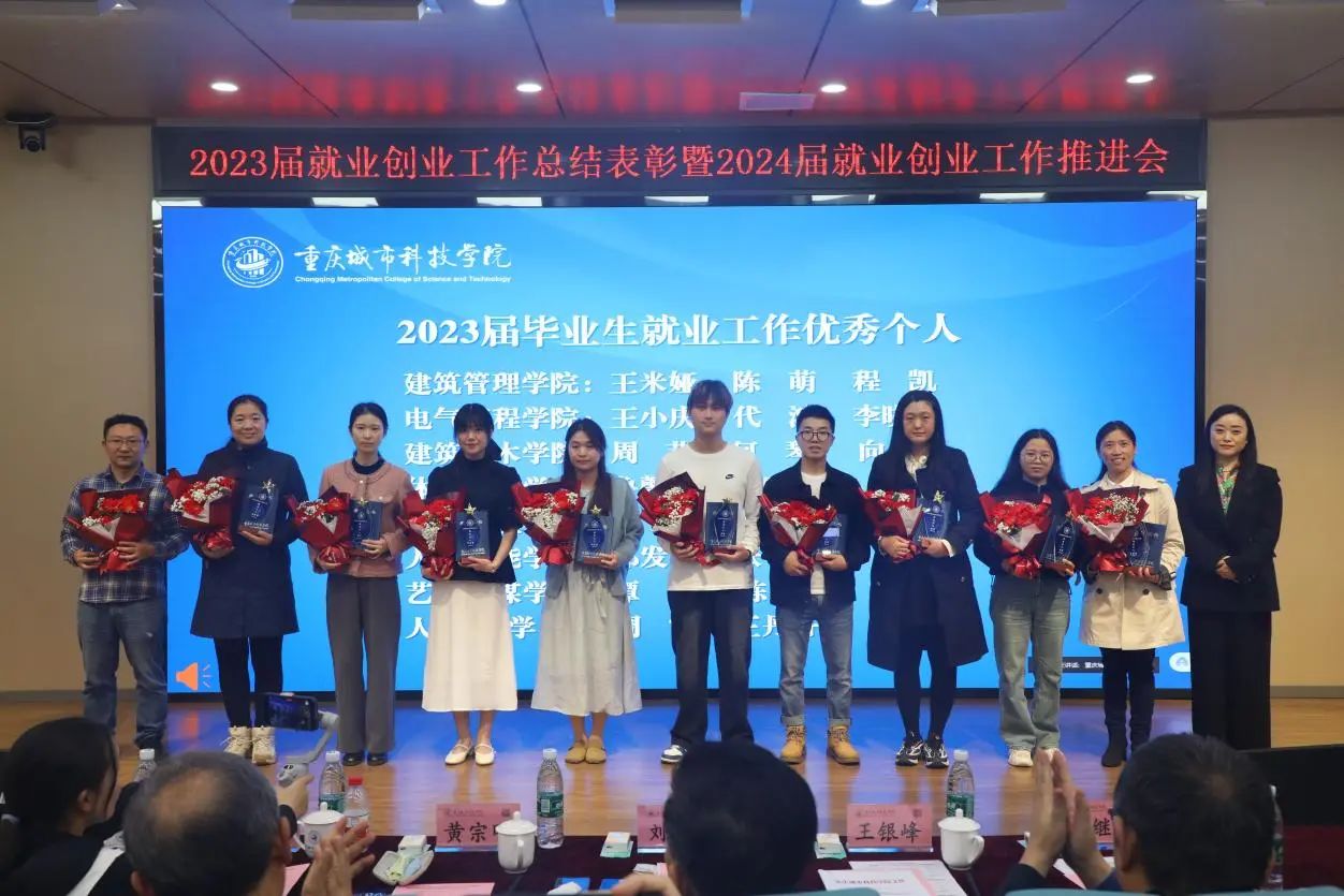 4月11日下午,重庆城市科技学院在第二学术报告厅举行2023年就业创业工作表彰会暨2024年就业创业推进会,总结2023年就业创业工作,表彰该阶段工作中作出突出贡献的先进集体和个人,并部署推进2024届毕业生就业工作稳步开展。学校领导刘学民、黄宗明、王银峰、贾瑞、田妍妮、崔继昌出席会议,学生处、教务处负责人,二级学院党政领导及系(教研室)主任,大学生就业指导服务中心人员,2024届毕业班辅导员和相关获奖人员参加会议。大会由党委副书记、副校长贾瑞主持。