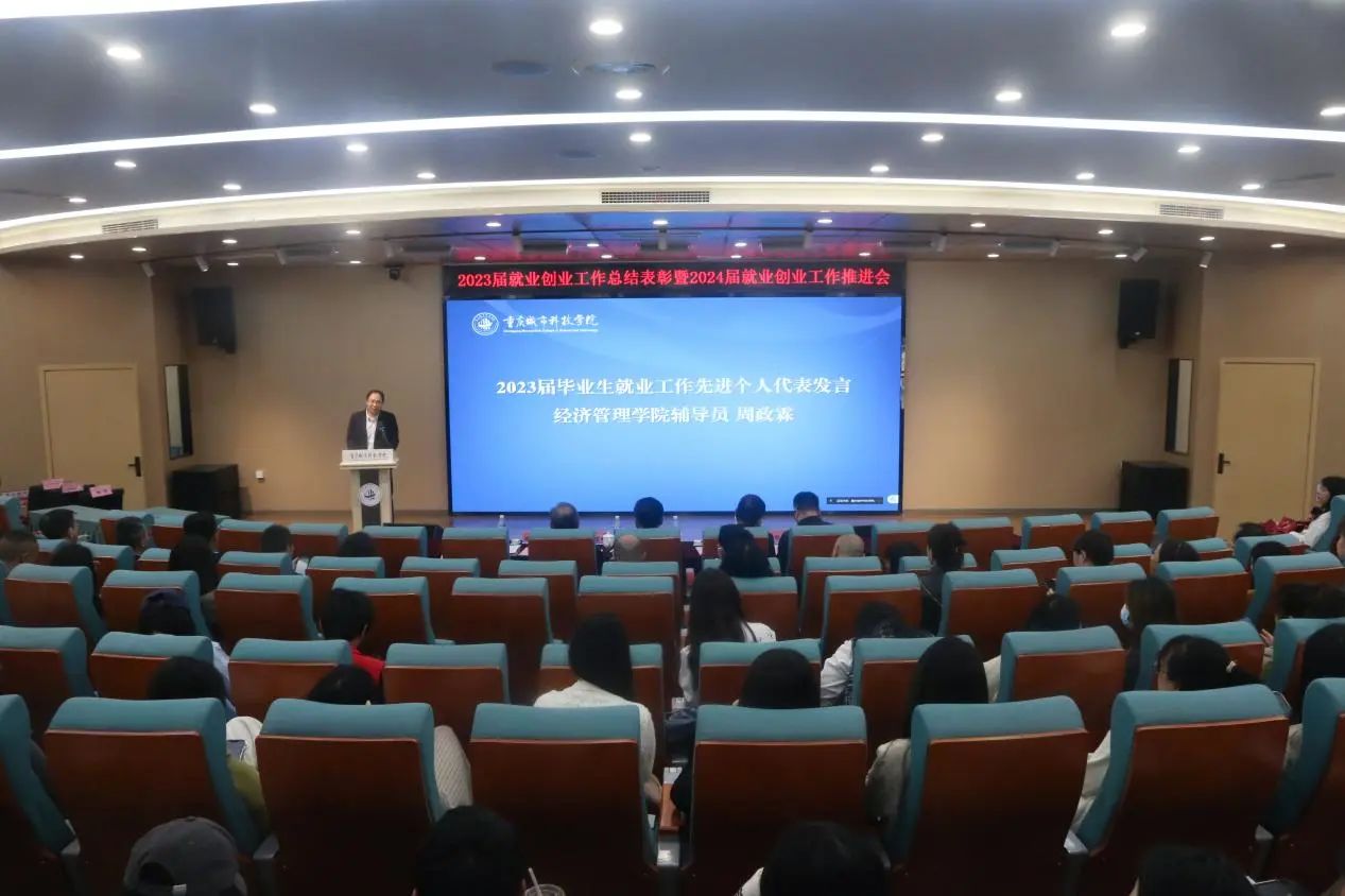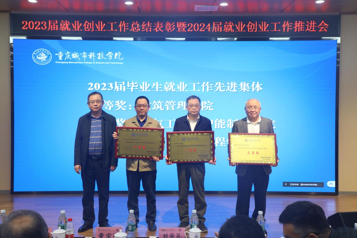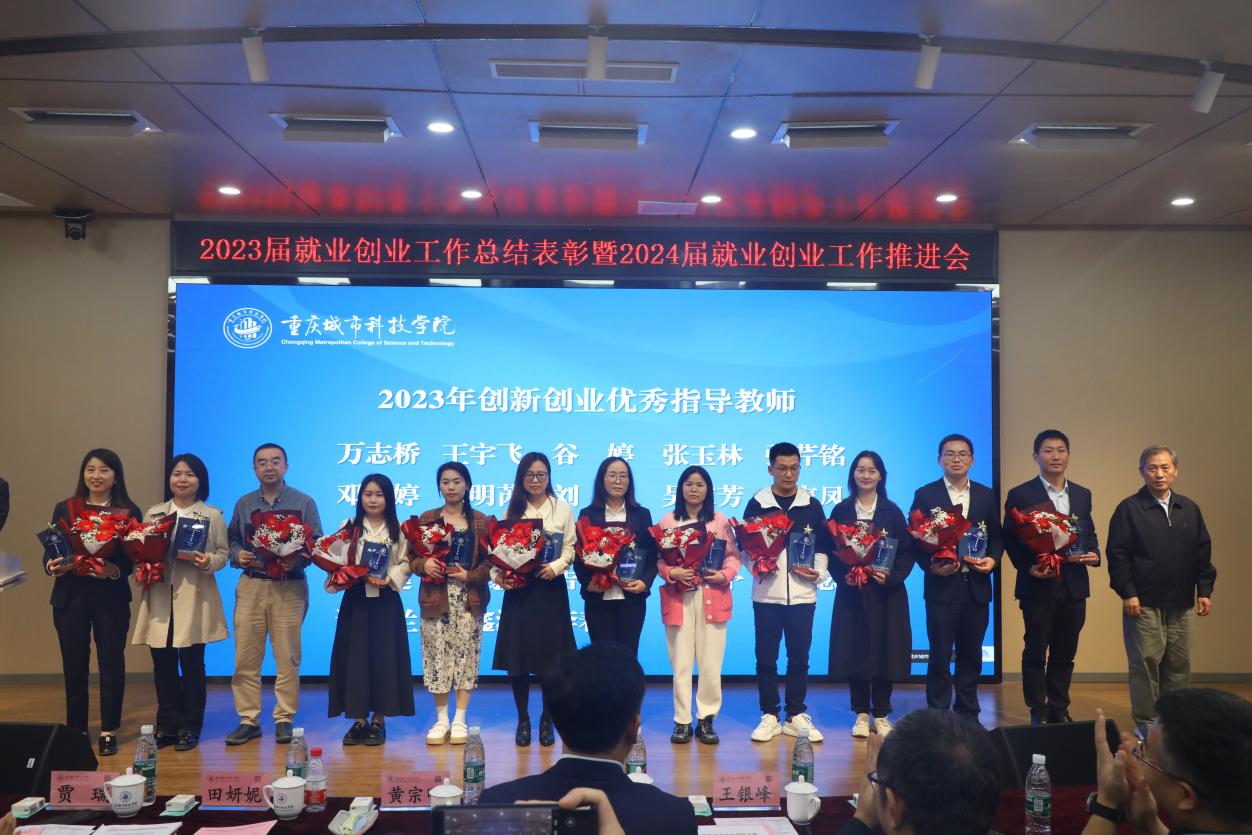 4月11日下午,重庆城市科技学院在第二学术报告厅举行2023年就业创业工作表彰会暨2024年就业创业推进会,总结2023年就业创业工作,表彰该阶段工作中作出突出贡献的先进集体和个人,并部署推进2024届毕业生就业工作稳步开展。学校领导刘学民、黄宗明、王银峰、贾瑞、田妍妮、崔继昌出席会议,学生处、教务处负责人,二级学院党政领导及系(教研室)主任,大学生就业指导服务中心人员,2024届毕业班辅导员和相关获奖人员参加会议。大会由党委副书记、副校长贾瑞主持。