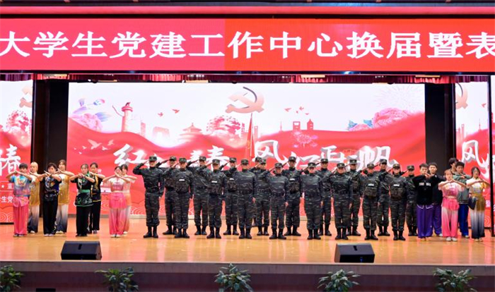 金戈铁马,铿锵回响。会议中段,由体育与大健康学院武术协会和退役士兵服务站将古与今结合,带来表演——《军武豪杰》。同学们将有血有肉的人民子弟兵带到了舞台,振奋人心。