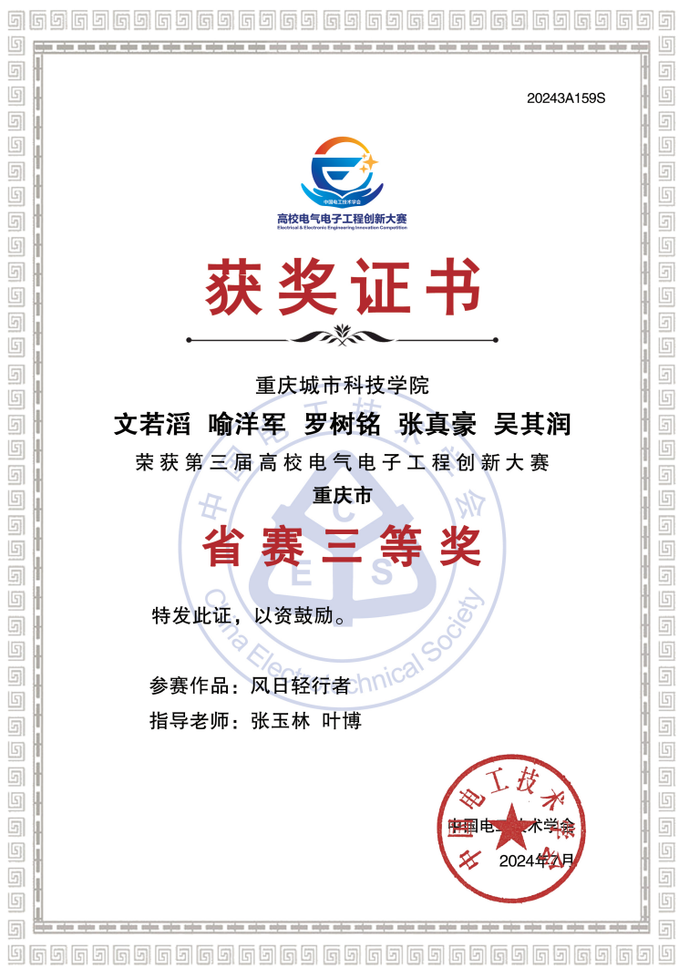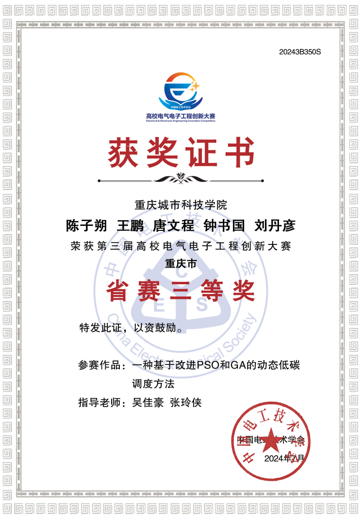 2024年7月6日,第三届高校电气电子工程创新大赛西部赛区复赛在重庆市落下帷幕。重庆城市科技学院电气工程与智能制造学院参赛的两组学生团队(学生:文若滔 喻洋军 罗树铭 张真豪 吴其润;指导教师:张玉林 叶博/学生:陈子朔 王鹏 唐文程 钟书国 刘丹彦;指导教师:吴佳豪 张玲侠)的作品《风日轻行者》以及《一种基于改进PSO和GA的动态低碳调度方法》经过层层选拔、一路过关斩将,出色完成西部赛区复赛线下作品动态评审和答辩,在本届高校电气电子工程创新大赛西部赛区复赛中分别荣获市级三等奖!这是学校首次参加该比赛取得的不错的好成绩。经过这次比赛,增长了学生的比赛经验,为下一次参赛做好充足准备。