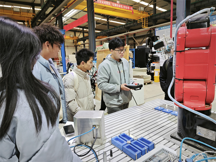 同学们参观了华中数控基地展厅,全面了解了公司的发展历程,切身感受到了企业发展给地区带来的社会影响力。同时,基地相关负责人向学生讲解了机械手的操作流程,并让同学们进行操作考核。