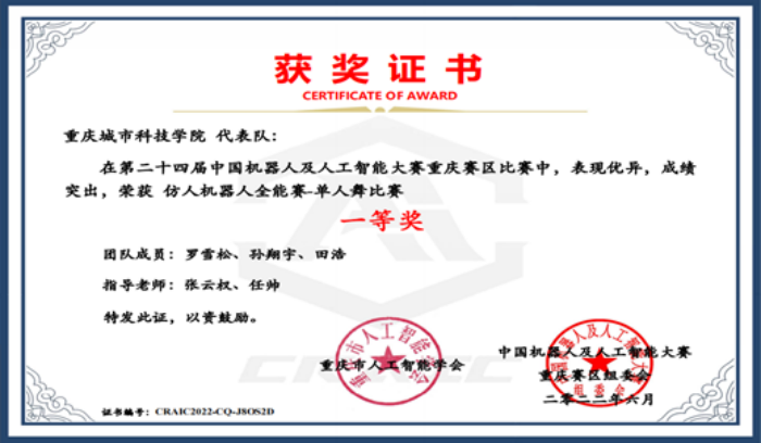 5月28日,我校首次参加第二十四届中国机器人及人工智能大赛重庆区域选拔赛,电气工程与智能制造学院共3名学子参加本次比赛,喜获仿人机器人全能赛中单人舞项目重庆市一等奖,仿人机器人全能赛中不规则地面运动项目的比赛被推选参加全国专项选拔赛。