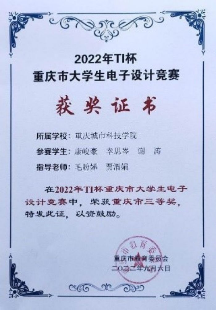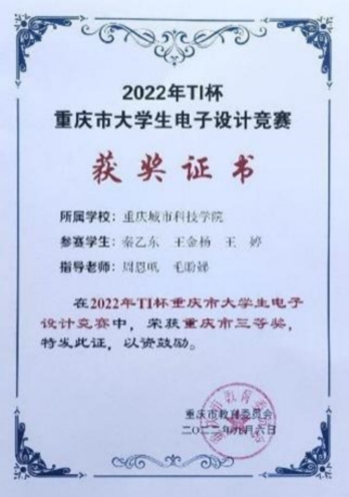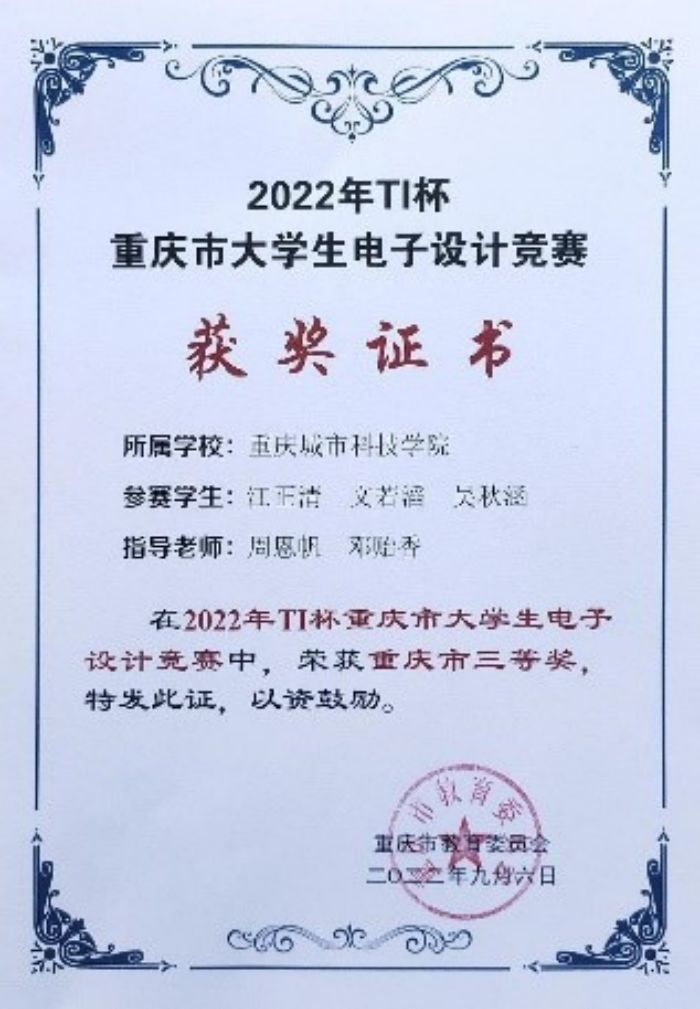 2022年7月底,由重庆市大学生电子设计竞赛委员会主办的TI杯重庆市大学生电子设计竞赛落下帷幕,我校学子表现出众,取得4个三等奖的优异成绩。