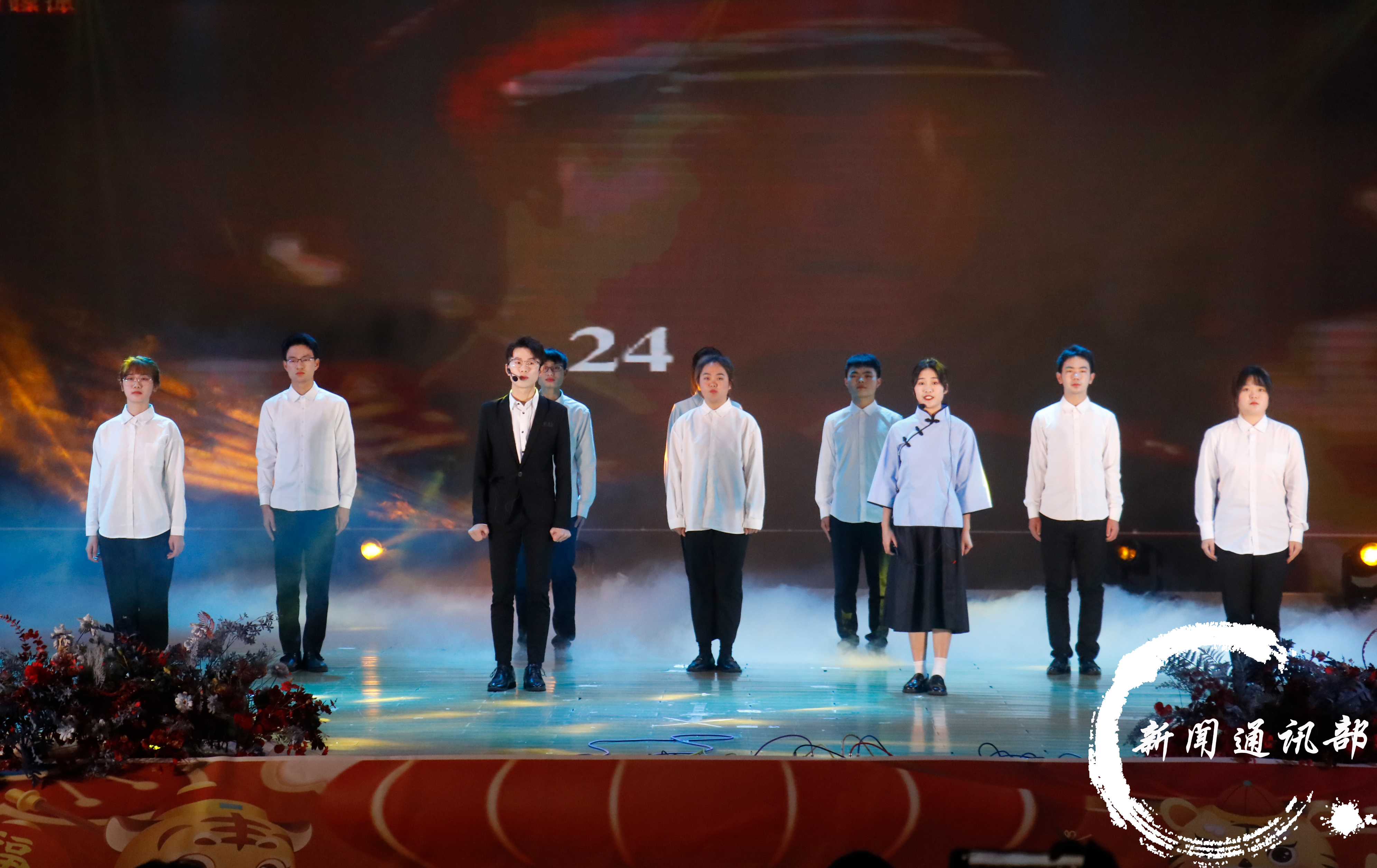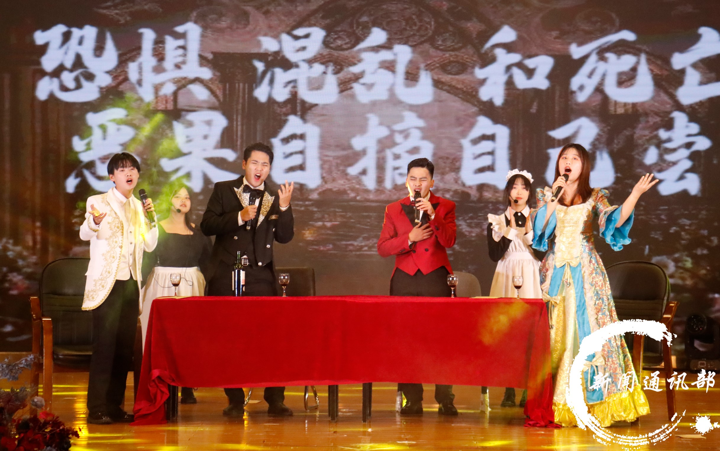 本次晚会以“玉粹金昭”为主题,由教师何沁遥,学生肖竣哲、王浩骅、符怡担任主持。晚会分为“月上海棠”,“霜天晚角”,“雨中花令”,“福寿千春”四个篇章,每个篇章都有对应不同意义节目,可谓精彩纷呈,高潮迭起。